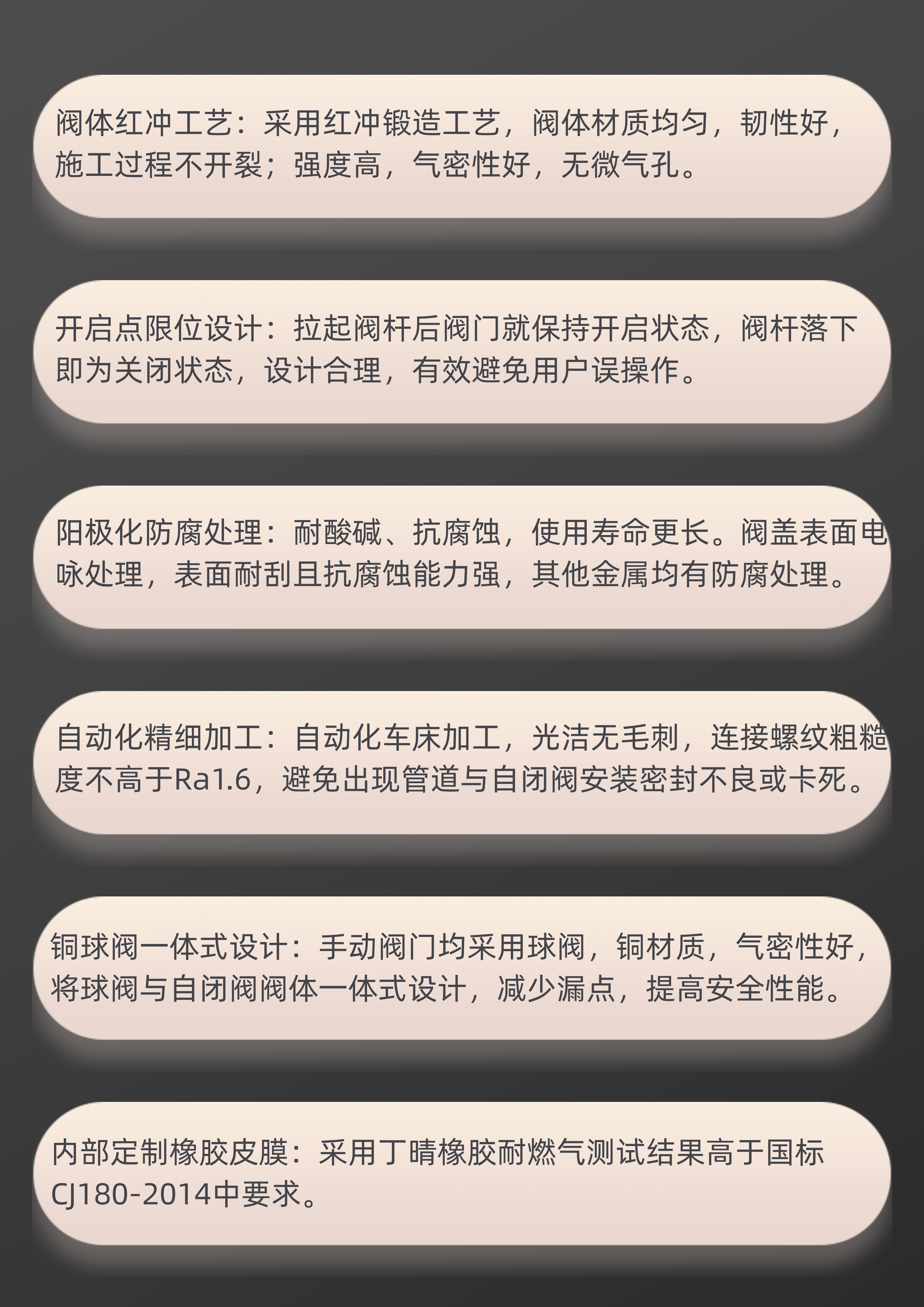 功耗低、安全可靠、操作方便。密封性能好、灵敏度高,动作可靠、体积小。开阀须经人工干预,手动开起,满足安全管理规范,符合事故处理点。