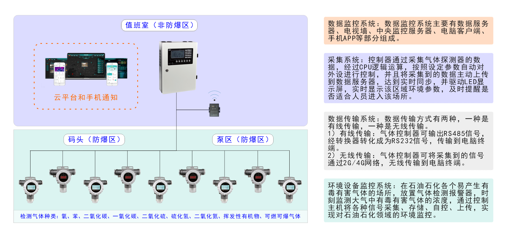 项目分析:硫化氢主要分布在炼化生产装置的干气、瓦斯气、酸性气、含硫污水、粗汽油、柴油、液化气、渣油、凝缩油等介质中,容易发生泄漏的部位有脱水口、采样口、排凝口、放空口、计量仪表接口等;氨主要存在于污水汽提装置、氨存储罐区、化纤污水处理装置等;苯蒸气主要存在于催化重整装置、芳烃抽提装置及存储罐区等;一氧化碳主要存在于锅炉、加热炉、燃烧室、烟气中。因此加强对石油石化行业的有毒有害气体检测具有十分重要的现实意义。
